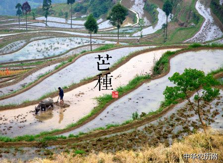芒种是表征麦类等有芒作物的成熟,是一个反映农业物候现象的节气。时至芒种四川盆地麦收季节已经过去,中稻、红苕移栽接近尾声。大部地区中稻进入返青阶段,秧苗嫩绿,一派生机。“东风染尽三千顷,折鹭飞来无处停”的诗句,生动的描绘了这时田野的秀丽景色。到了芒种时节,盆地内尚未移栽的中稻,应该抓紧栽插;如果再推迟,因气温提高,水稻营养生长期缩短,而且生长阶段又容易遭受干旱和病虫害,产量必然不高。红苕移栽至迟也要赶在夏至之前;如果栽苕过迟,不但干旱的影响会加重,而且待到秋来时温度下降,不利于薯块膨大,产量亦将明显降低。农谚“芒种忙忙栽”的道理就在这里。